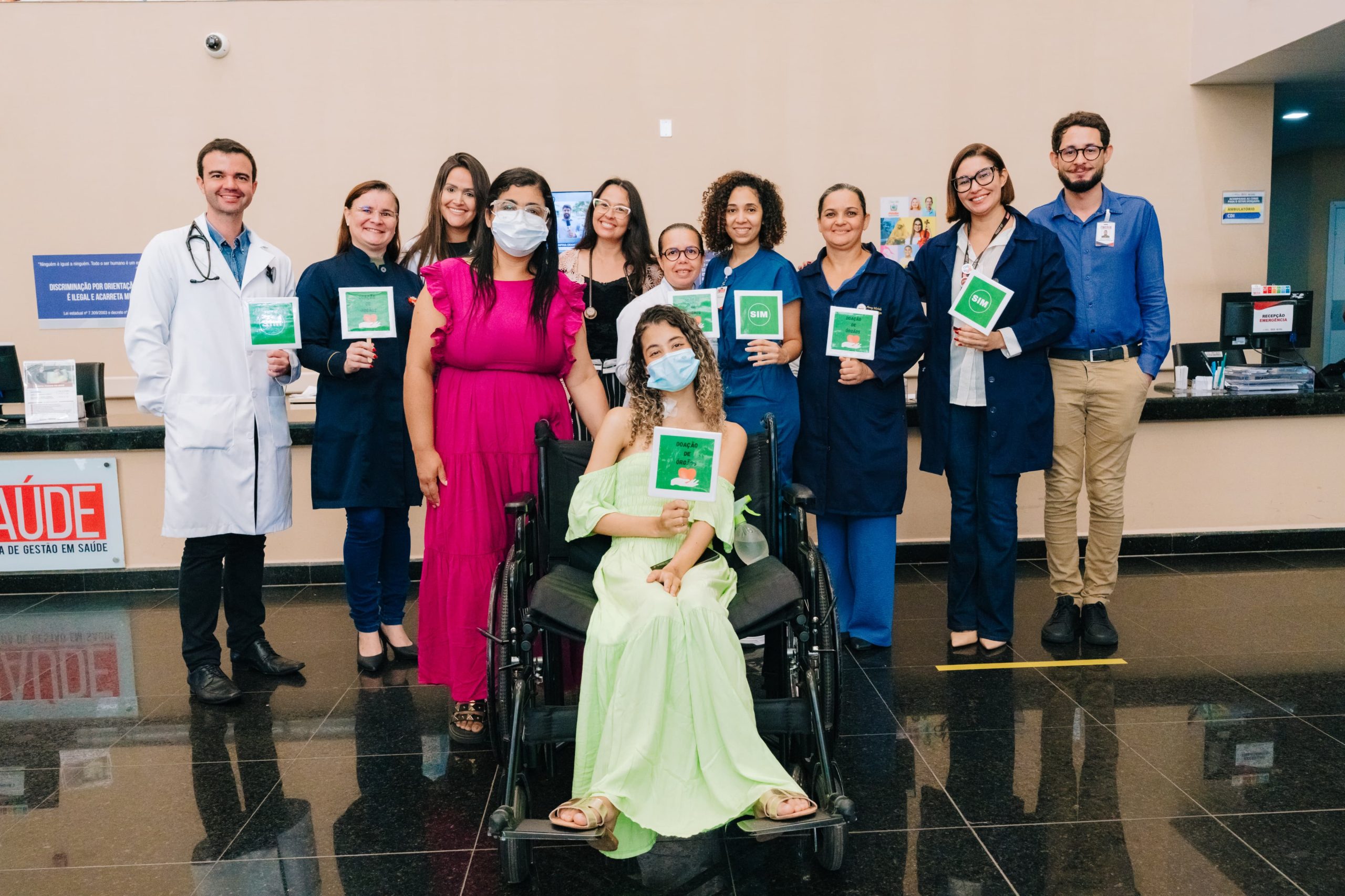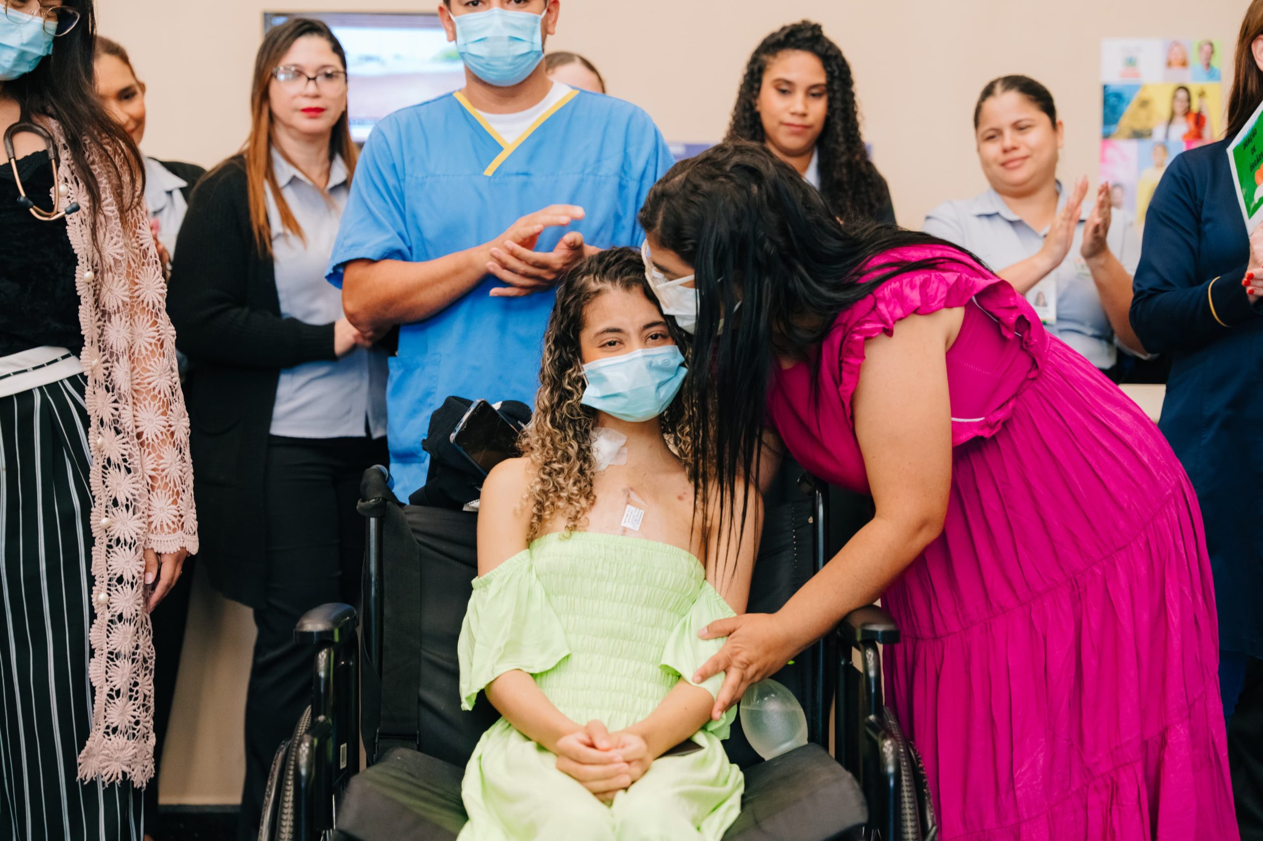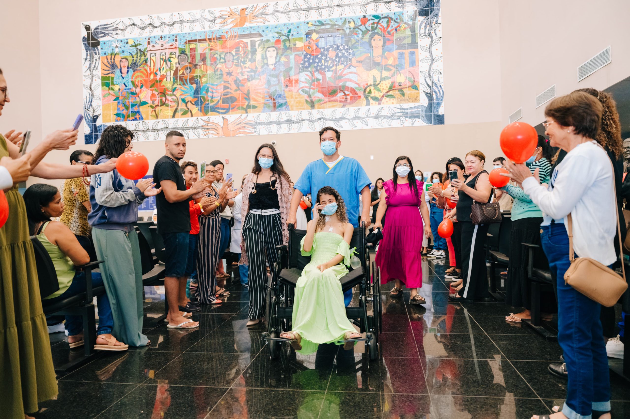 Na recepção do hospital, Andrielly foi recebida com aplausos e cânticos religiosos dos pacientes, acompanhantes e colaboradores da unidade. Um momento de muita emoção e agradecimento.